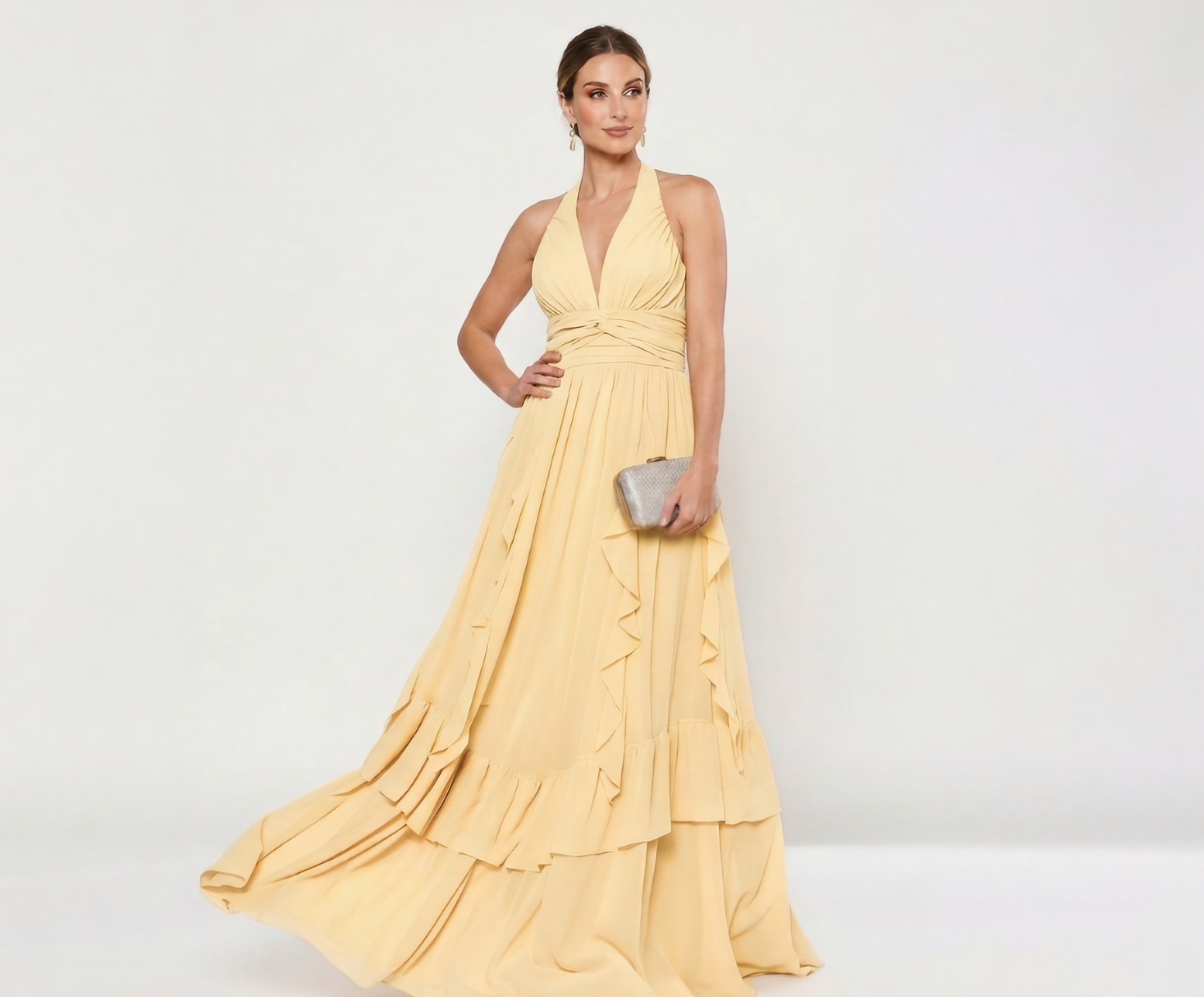Vestido Amarelo Pastel Longo Com Decote Halter e Babados Em Camadas