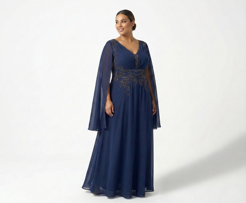 Vestido Azul Marinho em Tule com Bordado na Cintura e Manga Capa