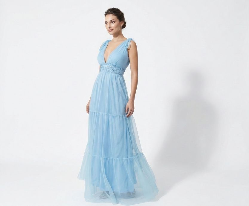 Vestido Azul Serenity com Decote e Saia em Tule Forrada