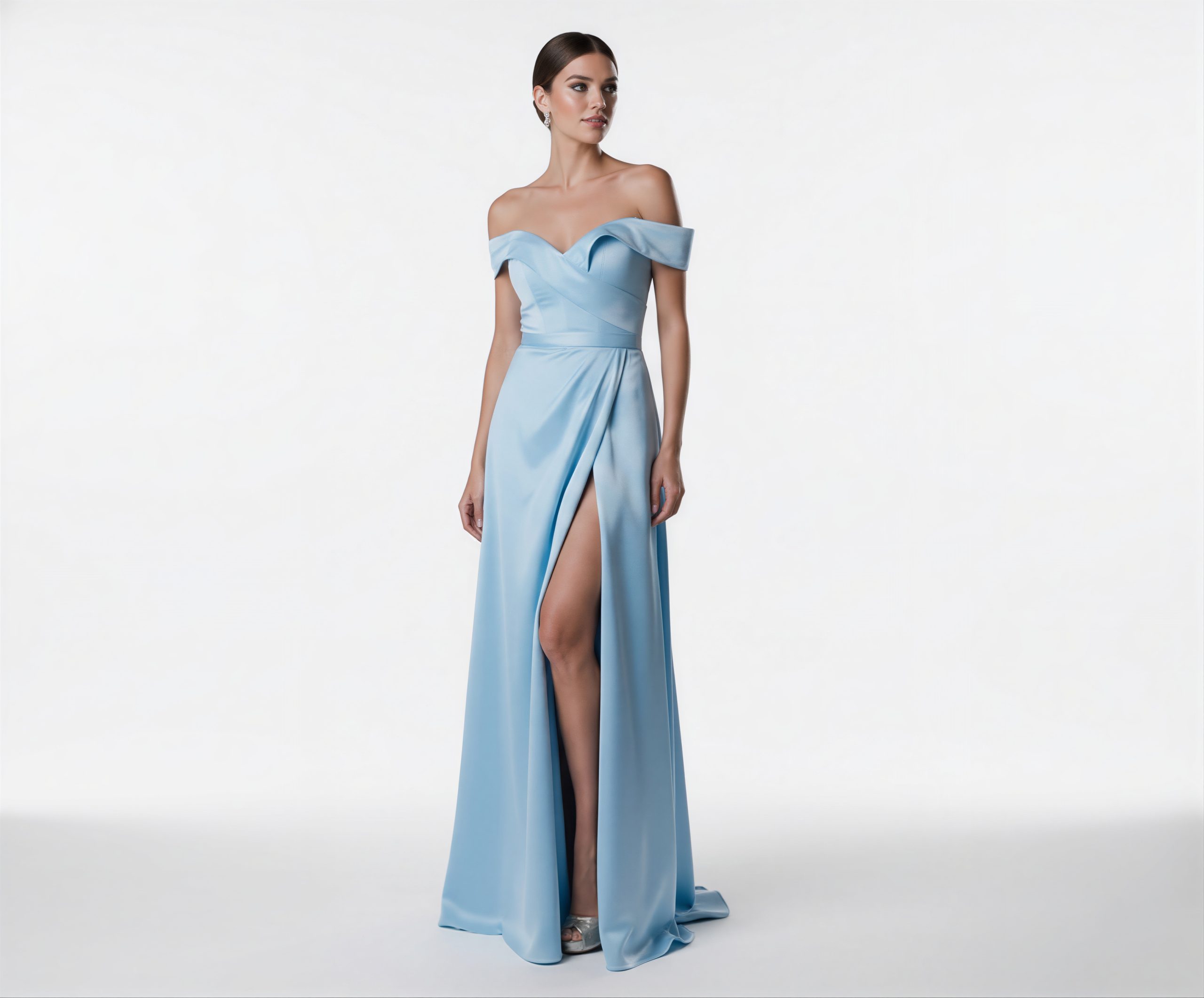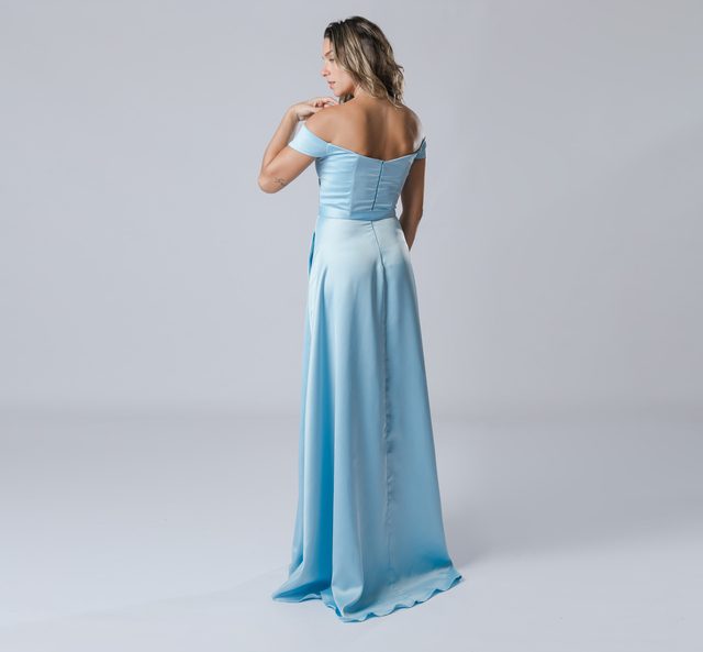 Vestido Azul Serenity, em Cetim Prada, Ombro a Ombro, com Fenda