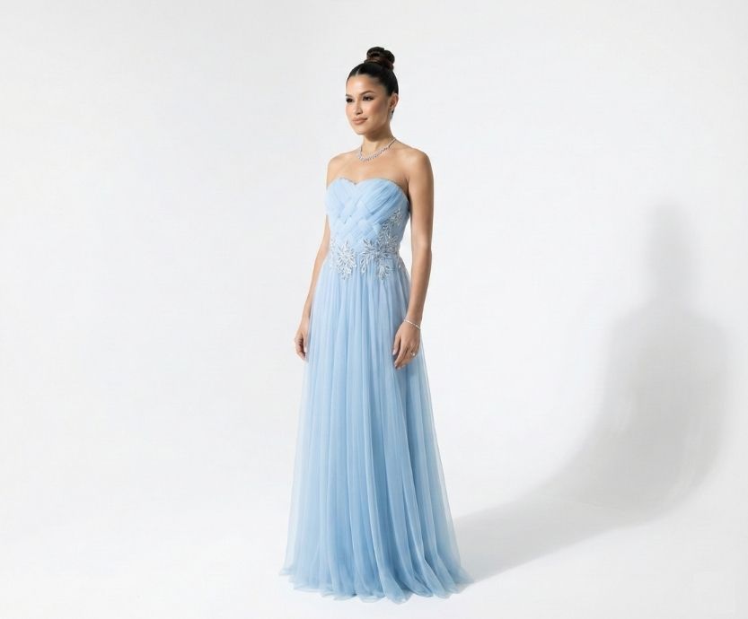 Vestido Azul Serenity em Tule com Corpo Trançado e Bordados na Cintura