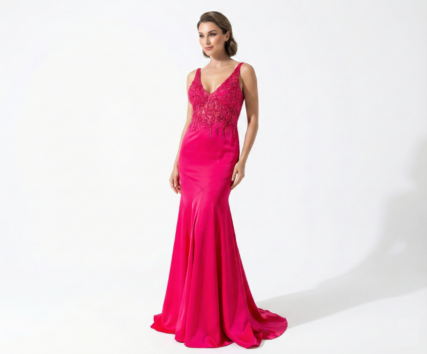 Vestido Pink, Sereia, com Recortes, Bordado em Paetê e Vidrílhos