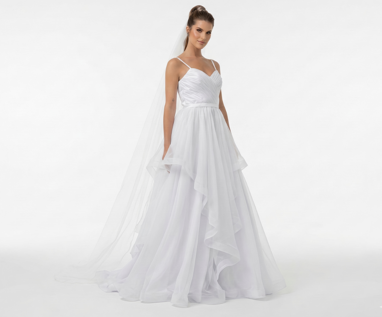 Vestido de Noiva com Corpete Fraseado e Saia em Camadas Cascata
