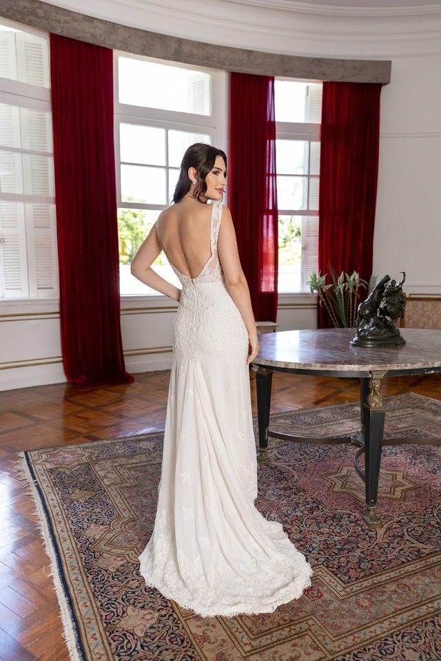 Esse vestido é ajustado especialmente para o seu corpo, com ajustes já inclusos no aluguel. Quando o modelo permite, também podemos adaptar detalhes como mangas, alças, bordados, fendas ou decotes.