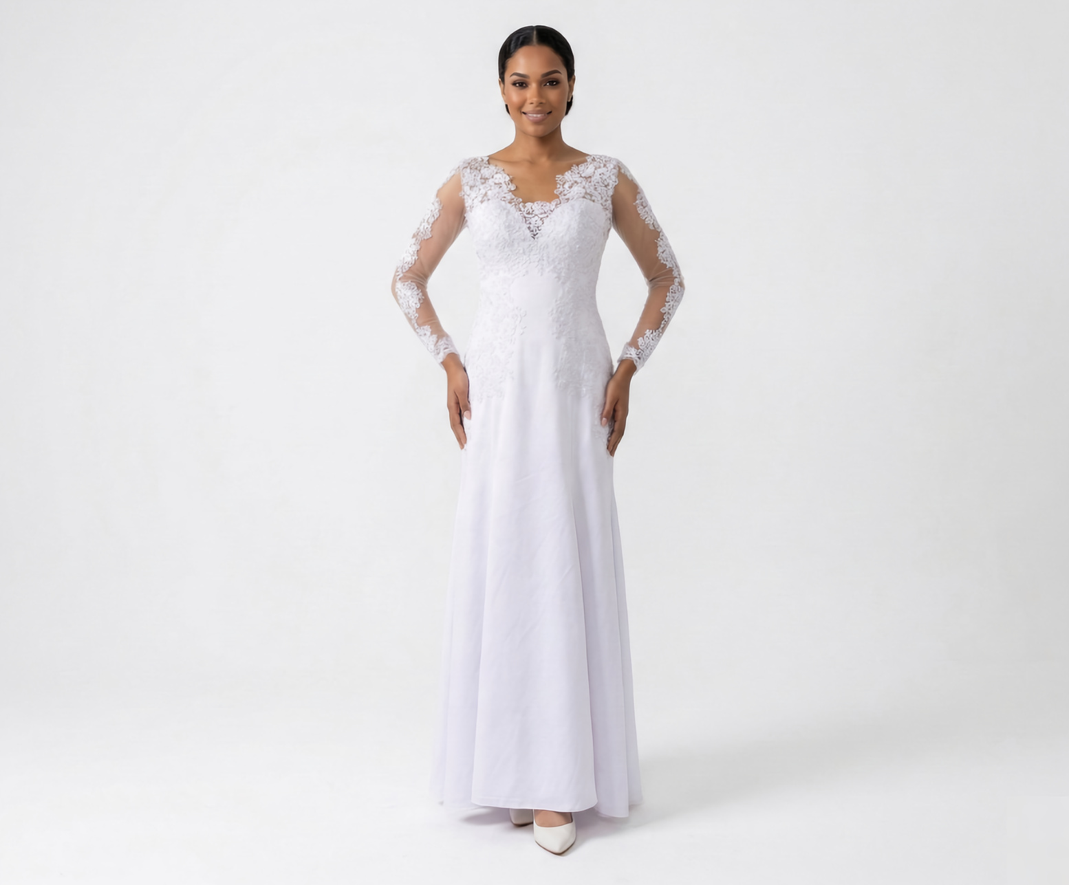 Esse vestido é ajustado especialmente para o seu corpo, com ajustes já inclusos no aluguel. Quando o modelo permite, também podemos adaptar detalhes como mangas, alças, bordados, fendas ou decotes.