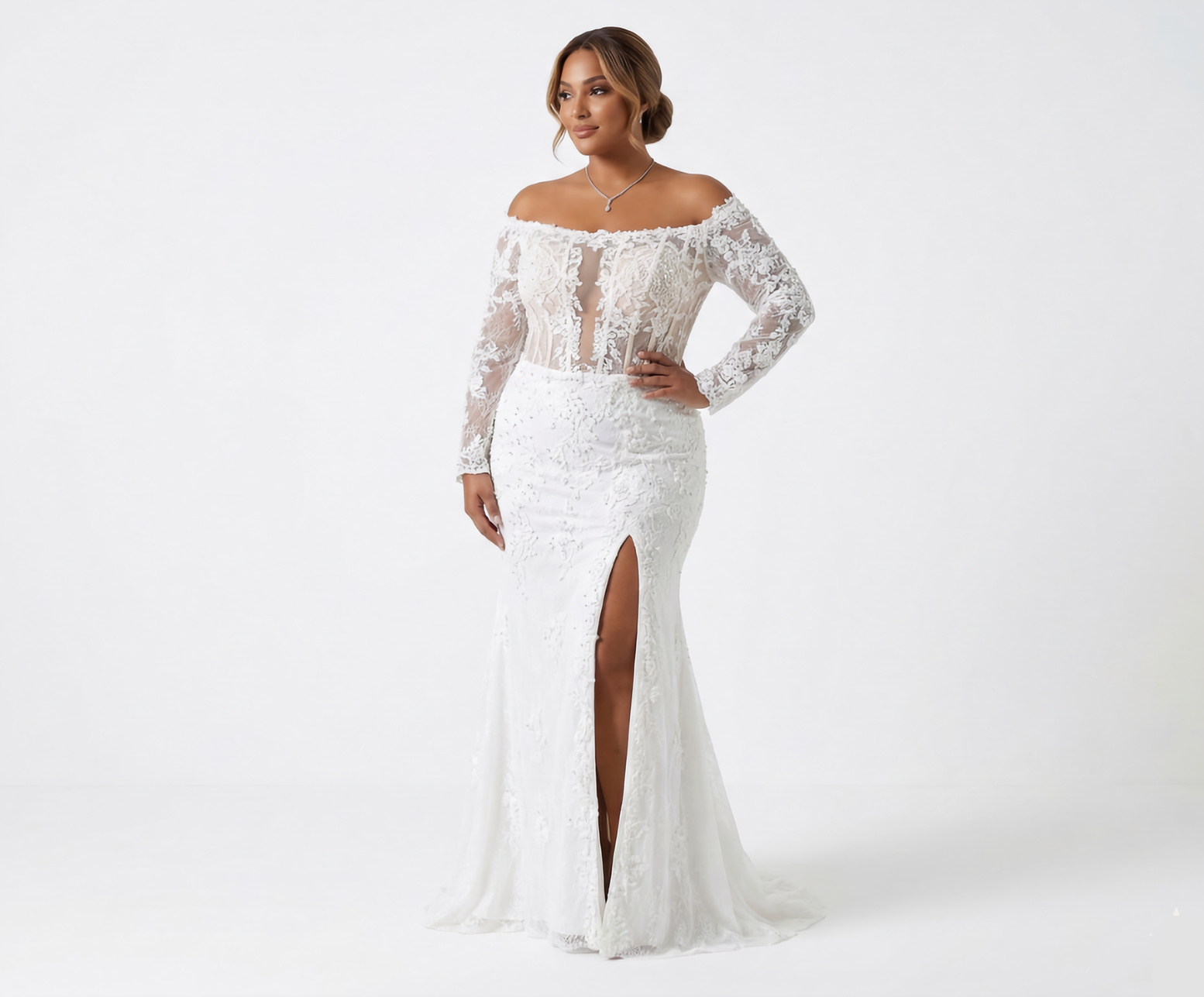 Vestido de Noiva Sereia em Renda com Decote Ombro a Ombro e Transparência no Corpete