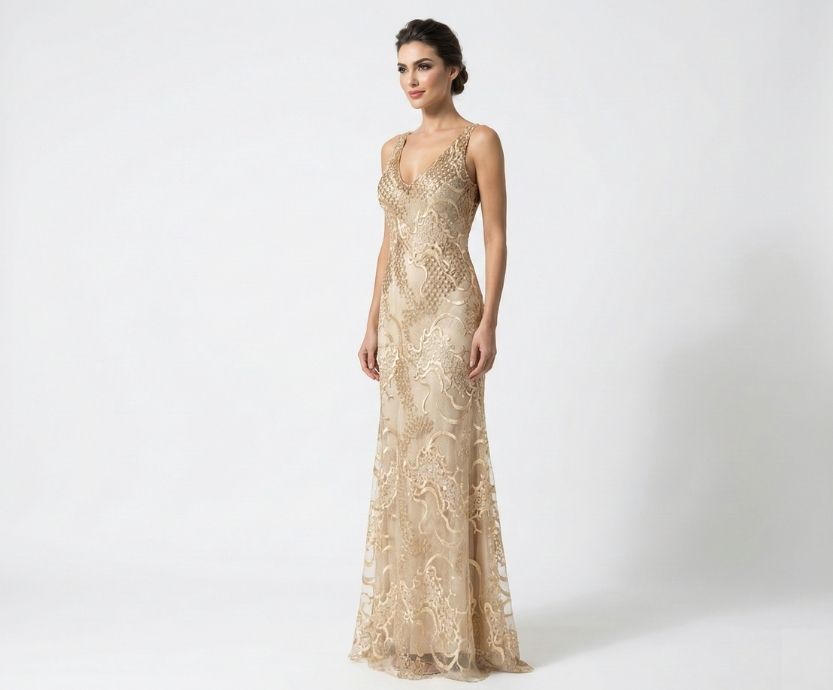 Vestido Dourado Sereia todo em Renda Leve Bordado