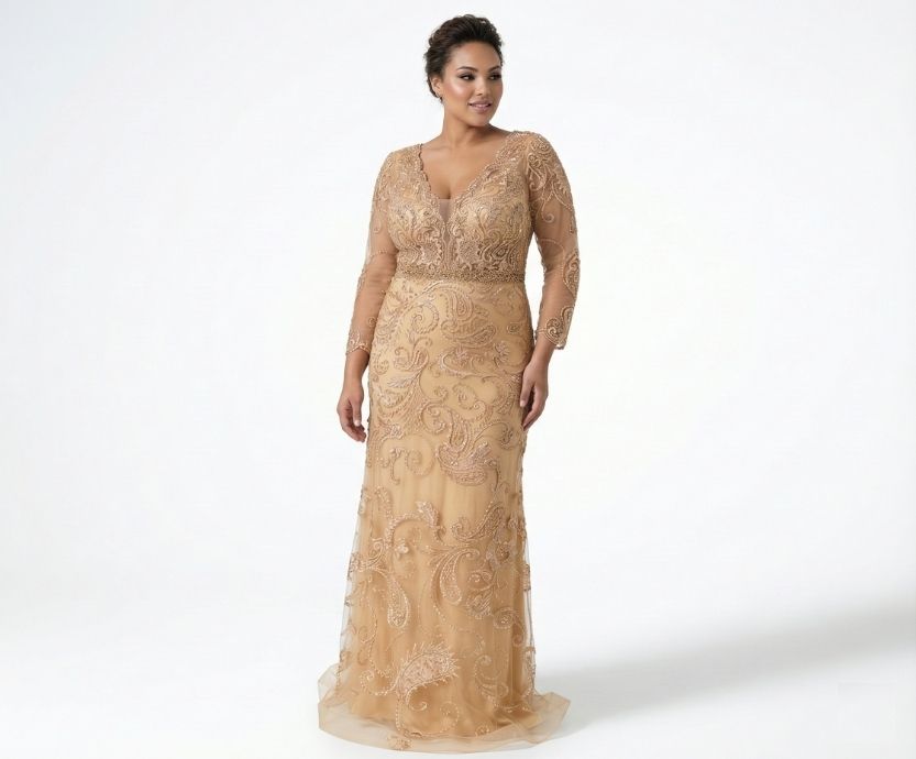 Vestido Dourado Todo Bordado com Transparência nas Mangas