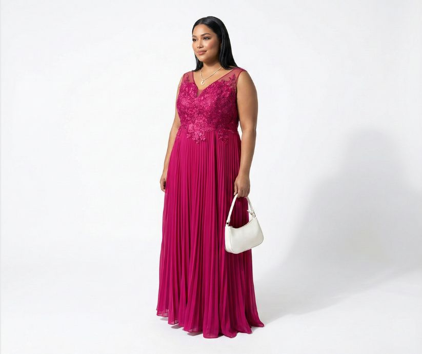 Vestido Fúcsia em Tule Plissado com Renda Floral no Busto e Decote em V