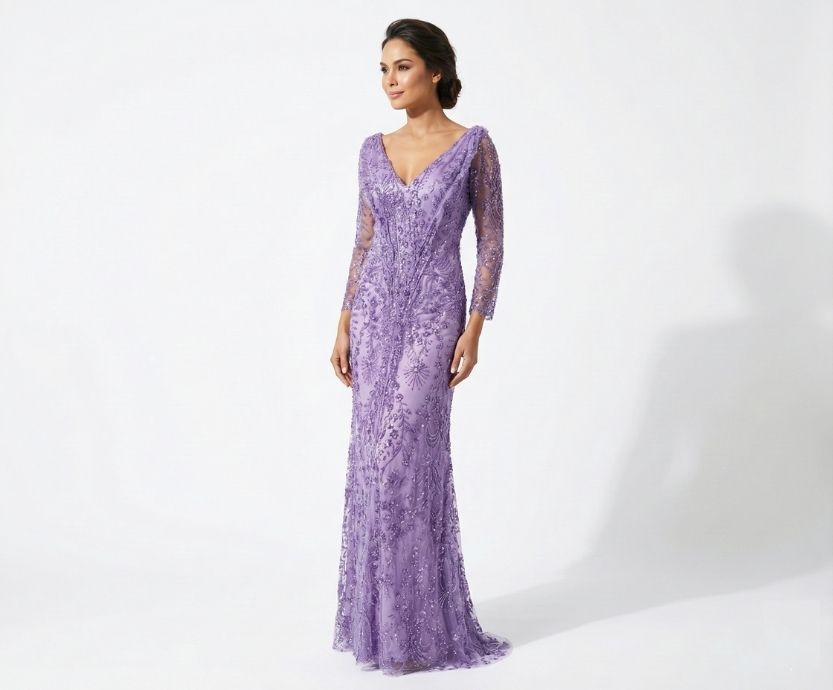 Vestido Lavanda em Renda Bordada, Manga 7/8