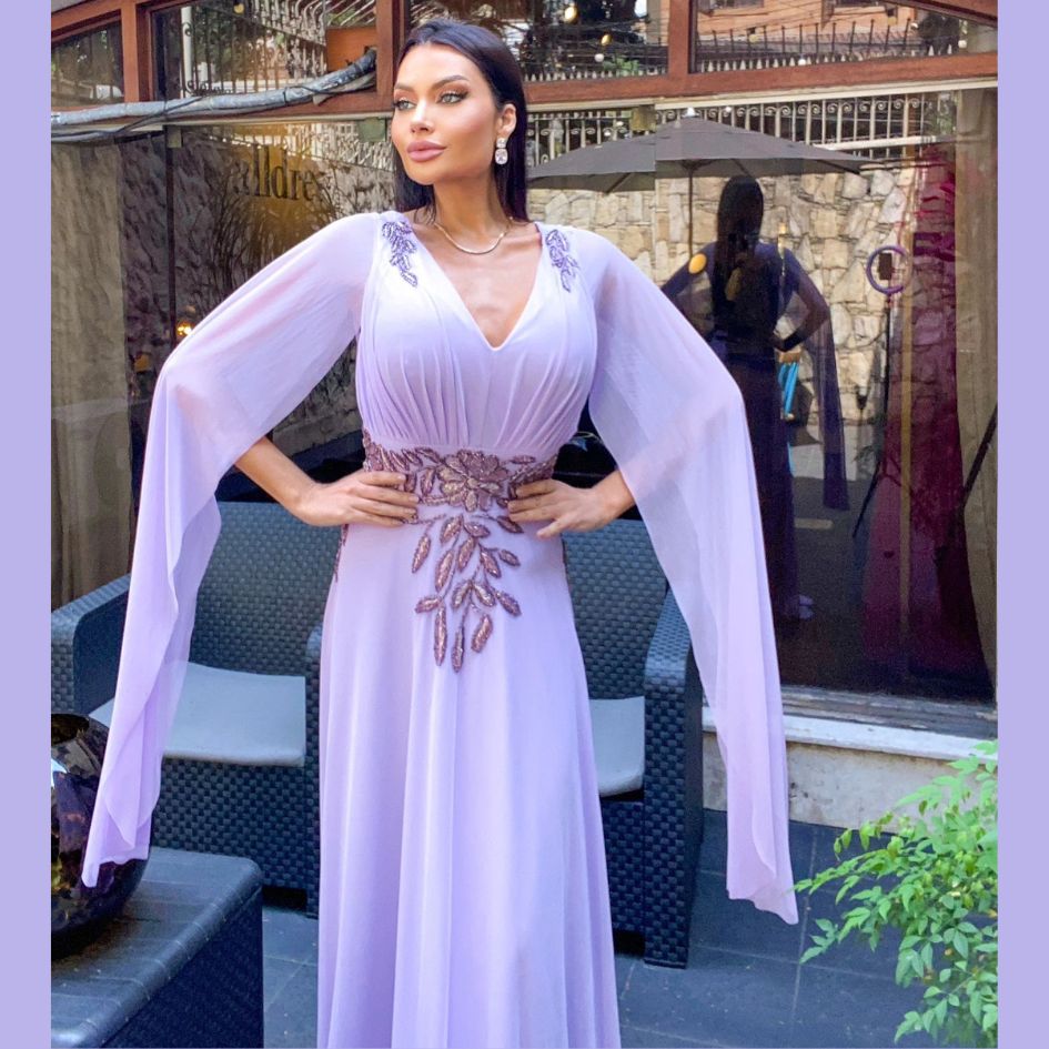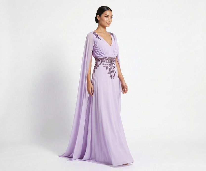 Vestido Lilás com Cintura e Ombro Bordados e Manga Lenço