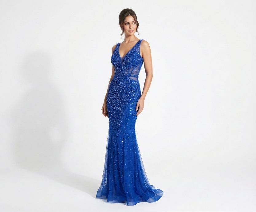 Vestido Longo Azul Royal Bordado, Decote Profundo Em ‘V’ E Modelagem Ajustada