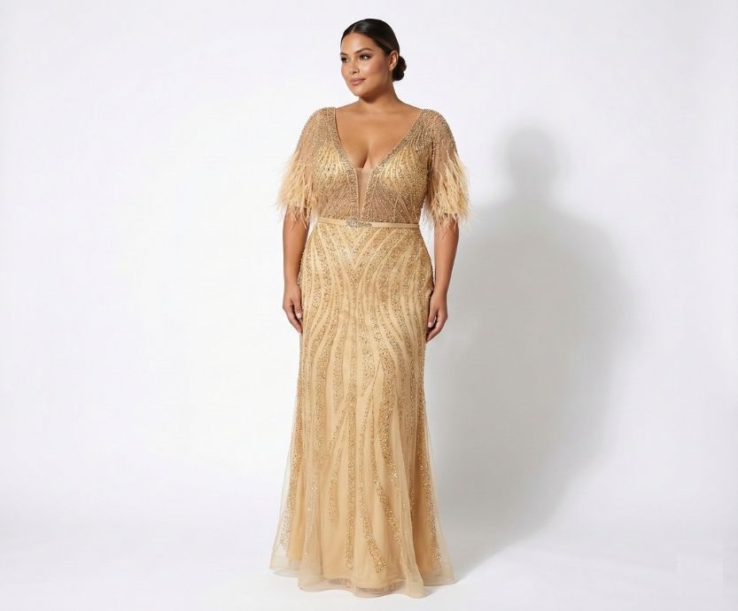 Vestido Longo Dourado Com Brilho, Decote V Profundo E Mangas Com Plumas