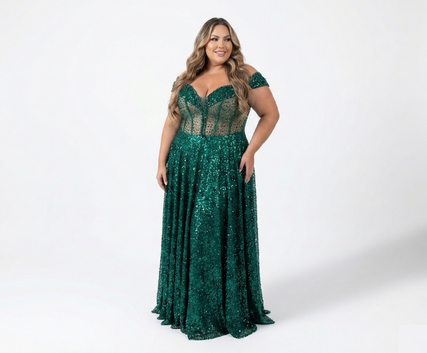 Vestido Longo Verde Esmeralda com Brilho e Corset Transparente