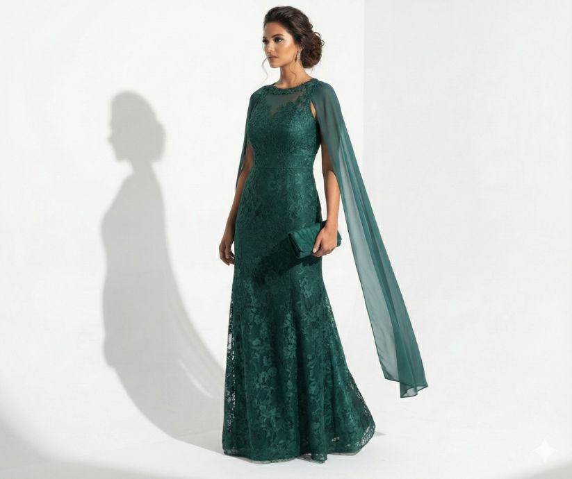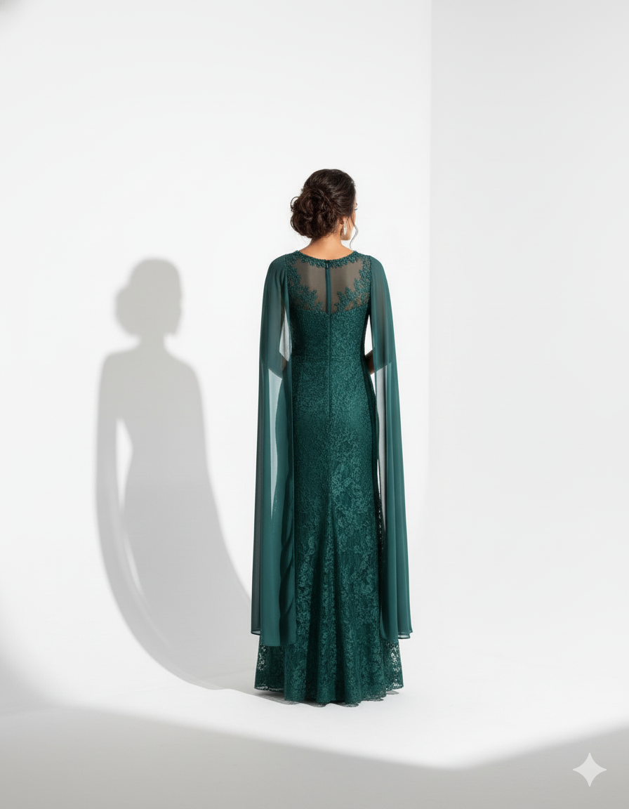 Vestido Longo Verde Esmeralda em Renda com Capa Fluida