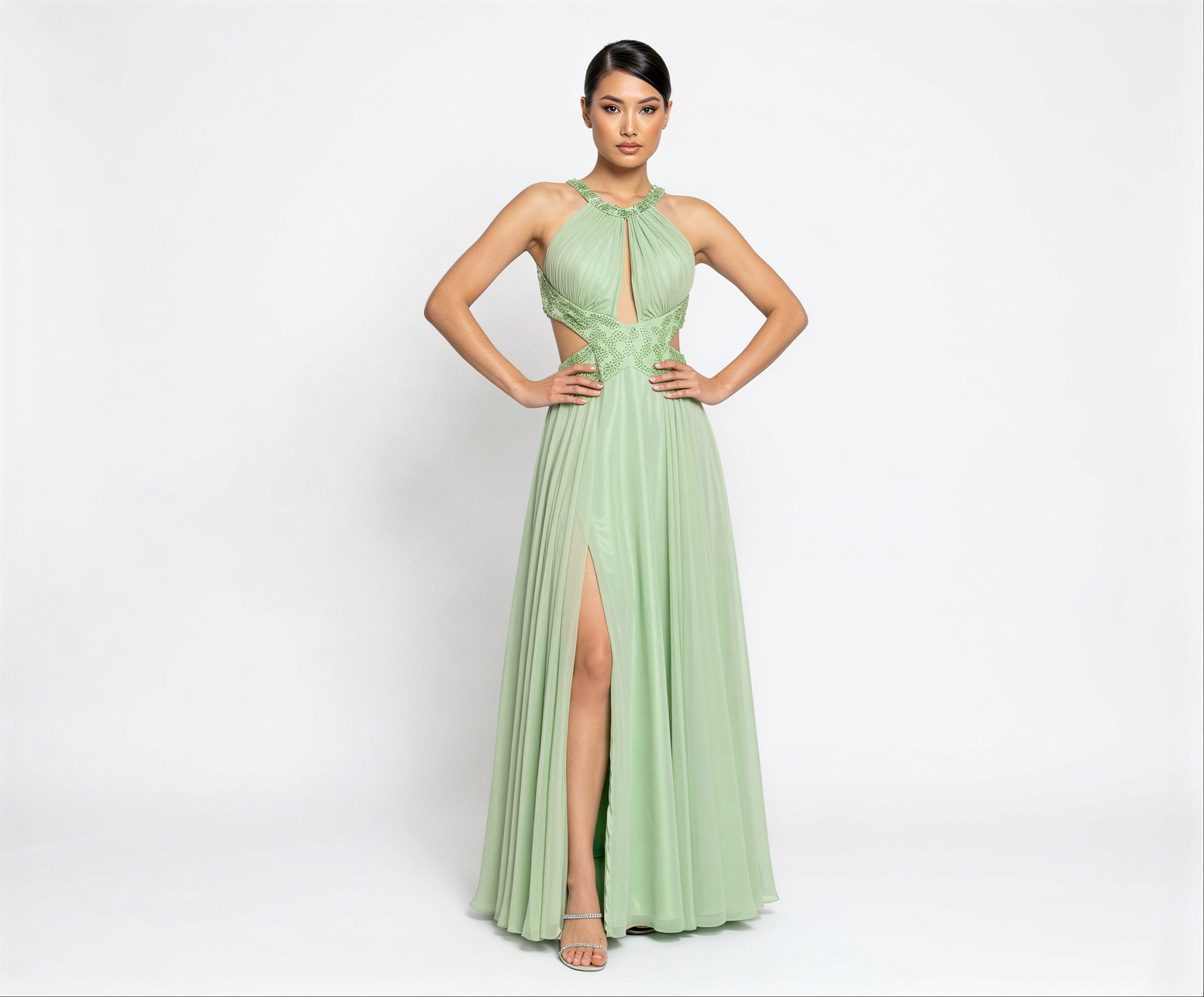 Vestido Verde Menta com Cintura e Pescoço Cravejado de Vidrilhos de Cristal e Pontos de Luz Vazado na Cintura e Aberto nas Costas