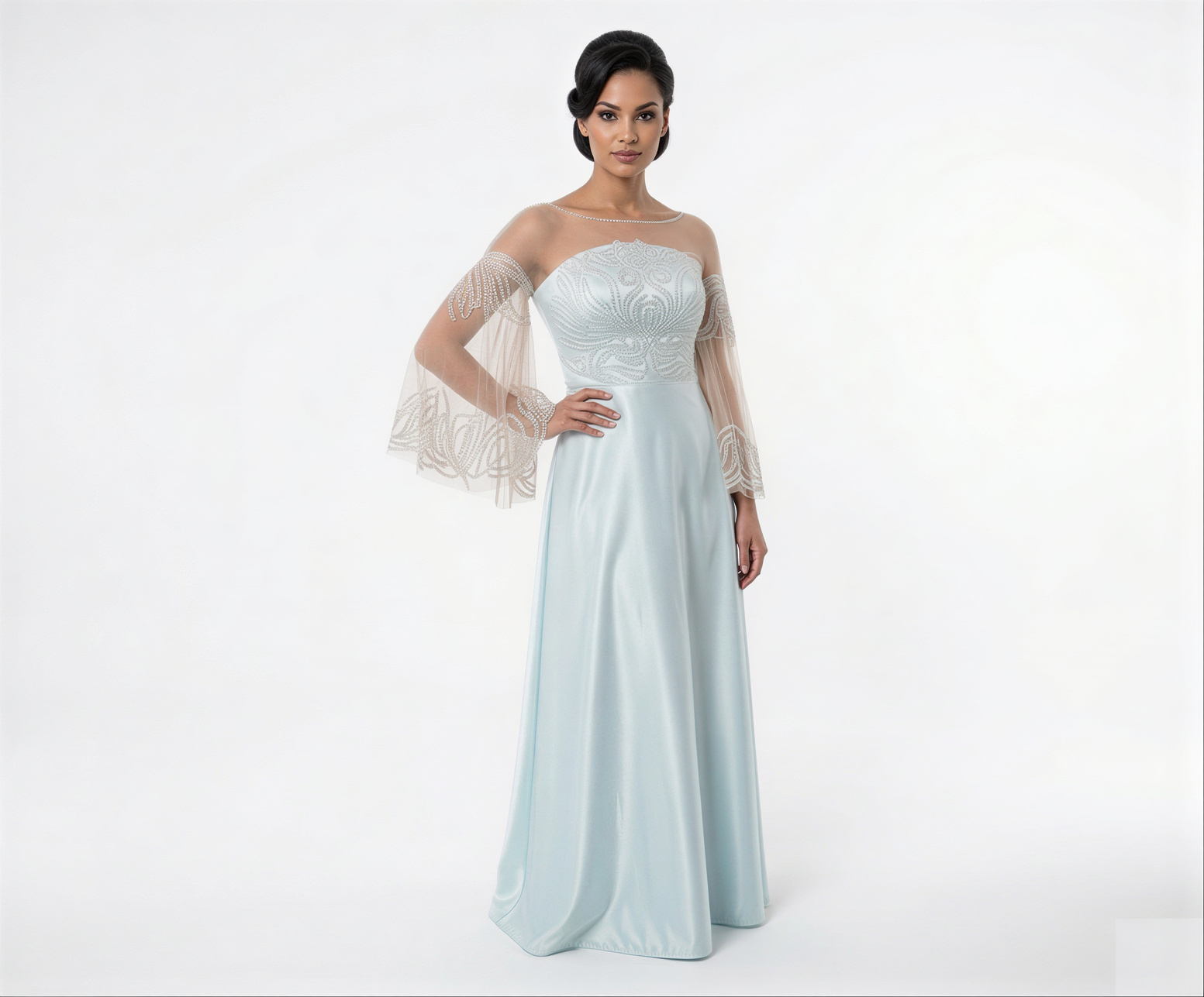 Vestido Longo Verde Menta, Reto, com Manga Flare, em Tule Todo Bordado