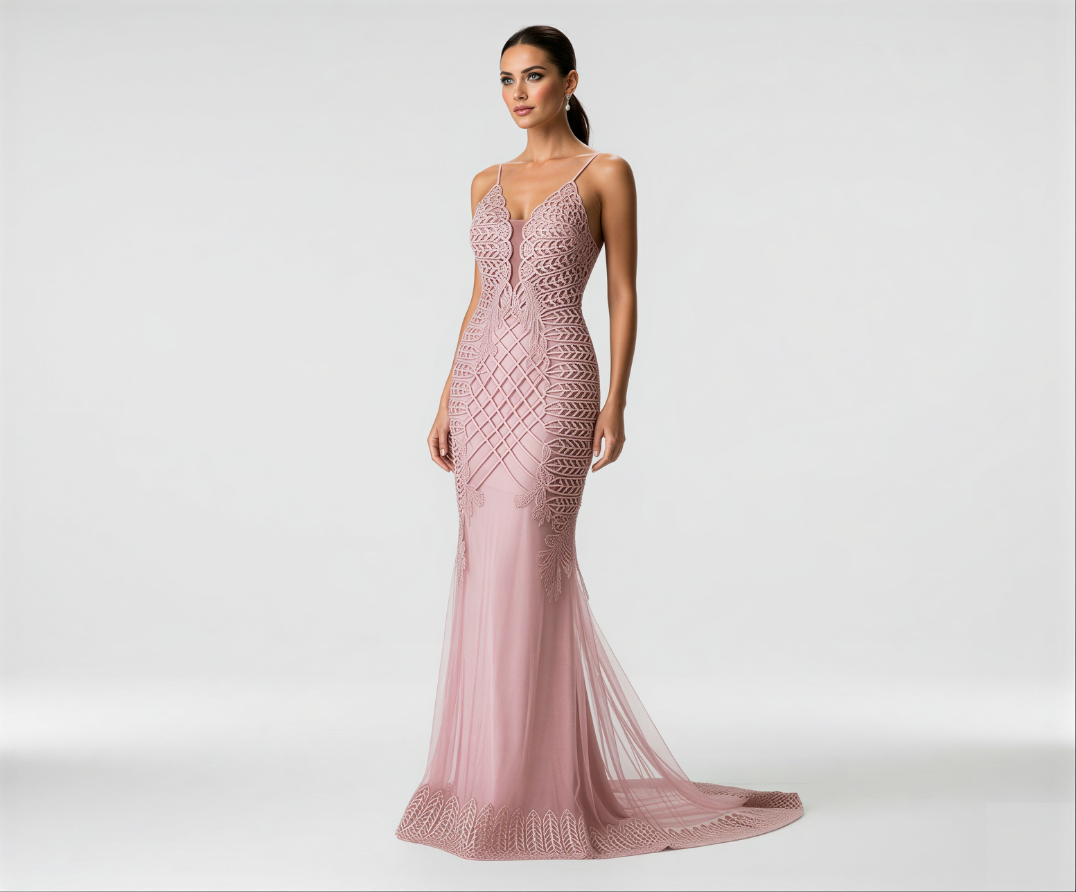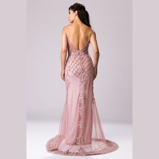 Vestido Rose, Sereia, Todo Bordado em Pérolas e Vidrílho com Barrado Bordado