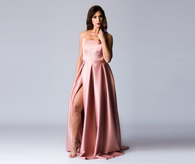 Vestido Rose em Cetim Prada, com Saia com Fenda & Nesgas