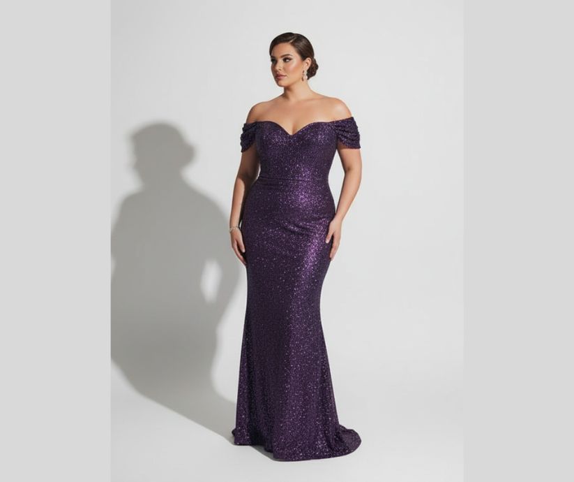 Vestido Roxo Ombro a Ombro com Brilho e Modelagem Sereia