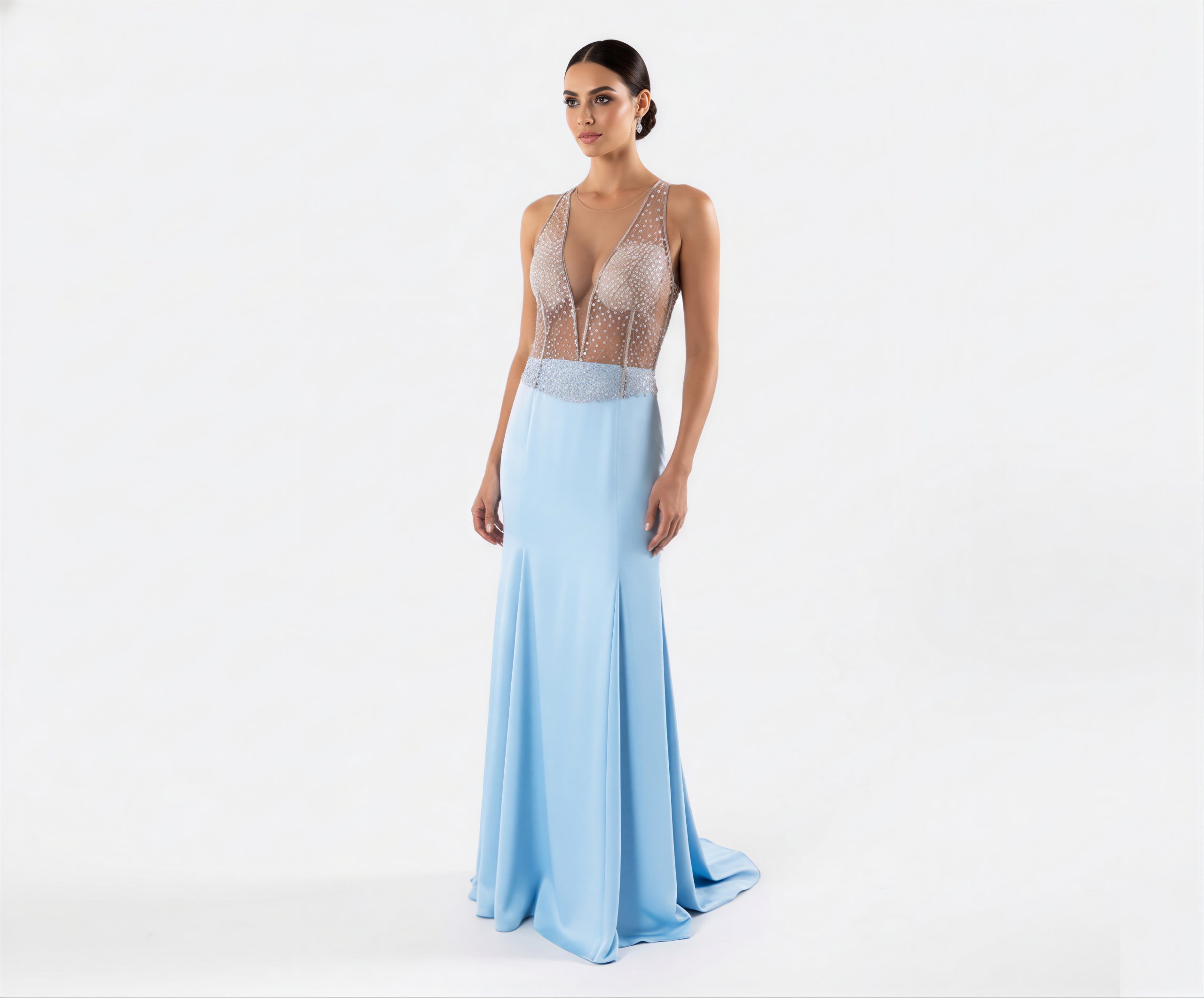 Vestido Sereia Azul Serenity com Corpete em Cristais