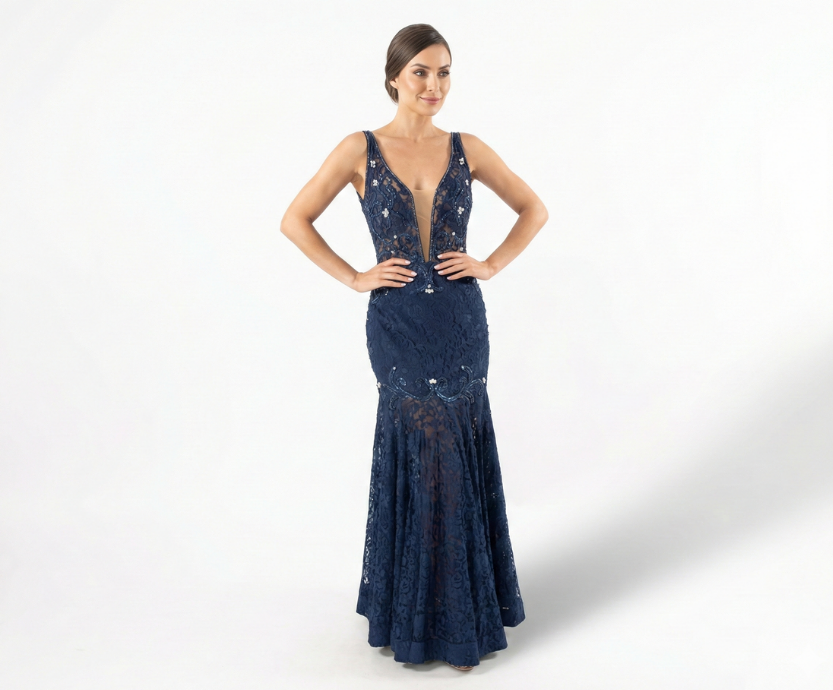 Vestido Sereia Todo Bordado em Renda Marinho