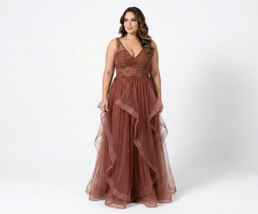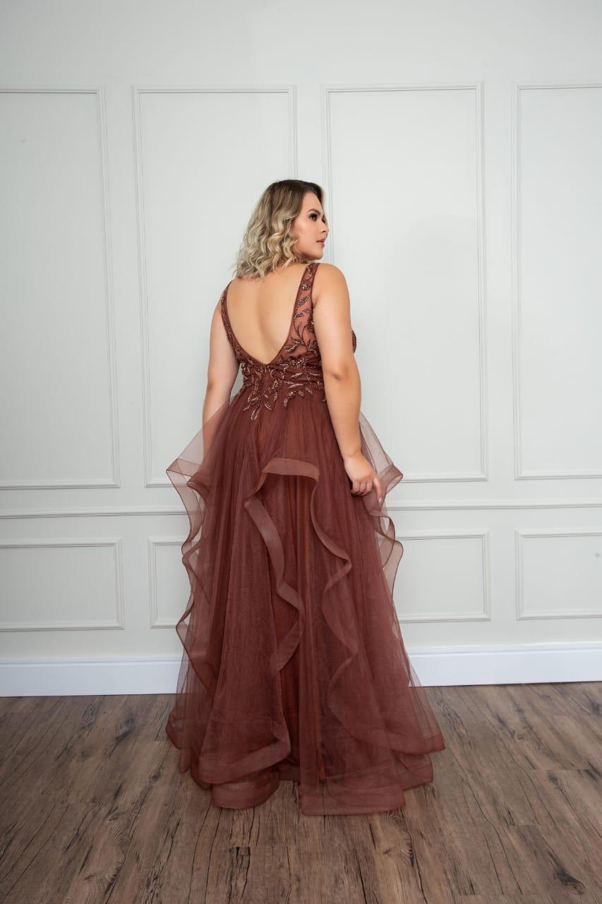 Vestido Marrom Bordado com Saia Crinol em Camadas