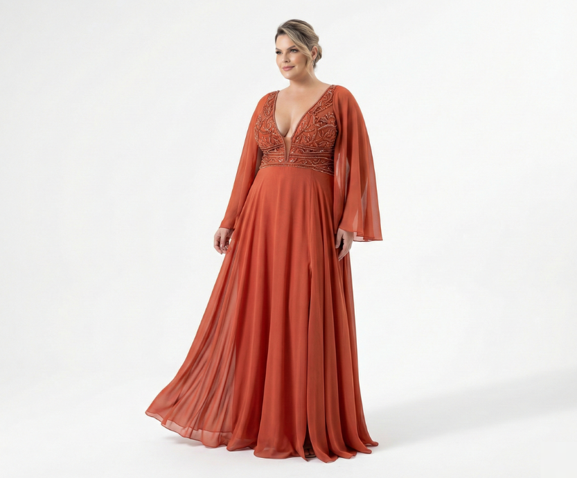 Vestido Terracota com Busto Bordado e Manga Lenço
