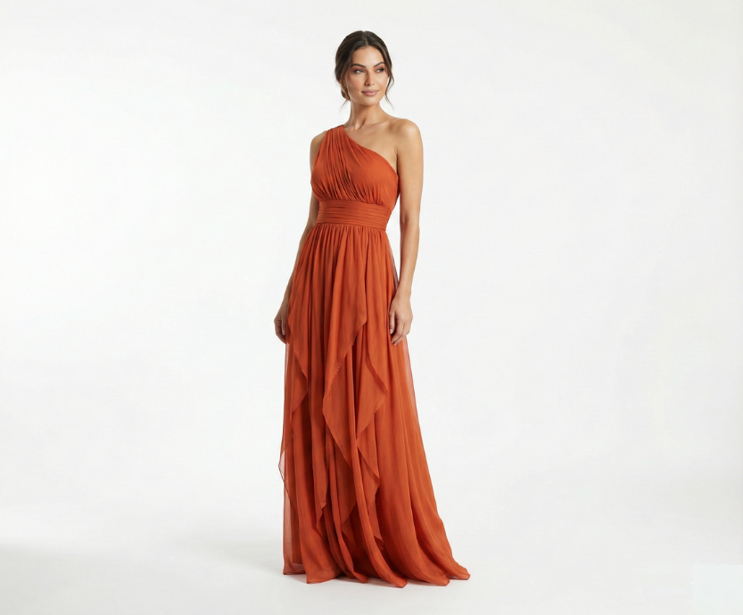 Vestido Terracota Um Ombro Só com Saia em Camadas
