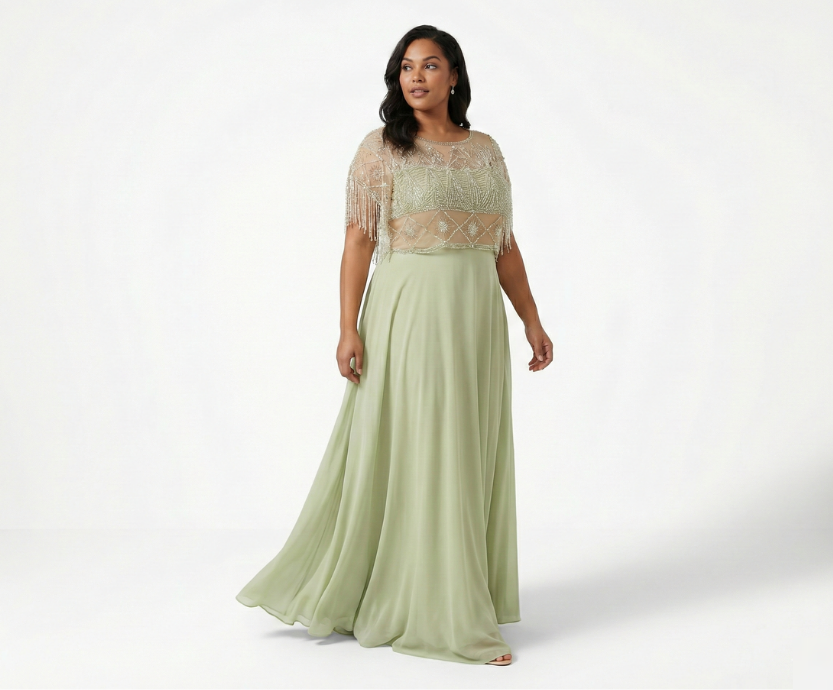 Vestido Verde Menta com Saia em Crepe, Bordado no Corpete, com Franjas na Manga