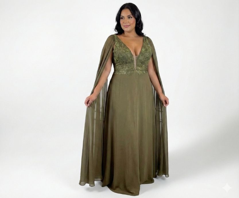 Vestido Verde Oliva com Busto Todo Bordado e Manga Capa