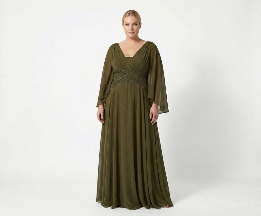 Vestido Verde Oliva com Manga Fluida, Decote em V e Bordado na Cintura
