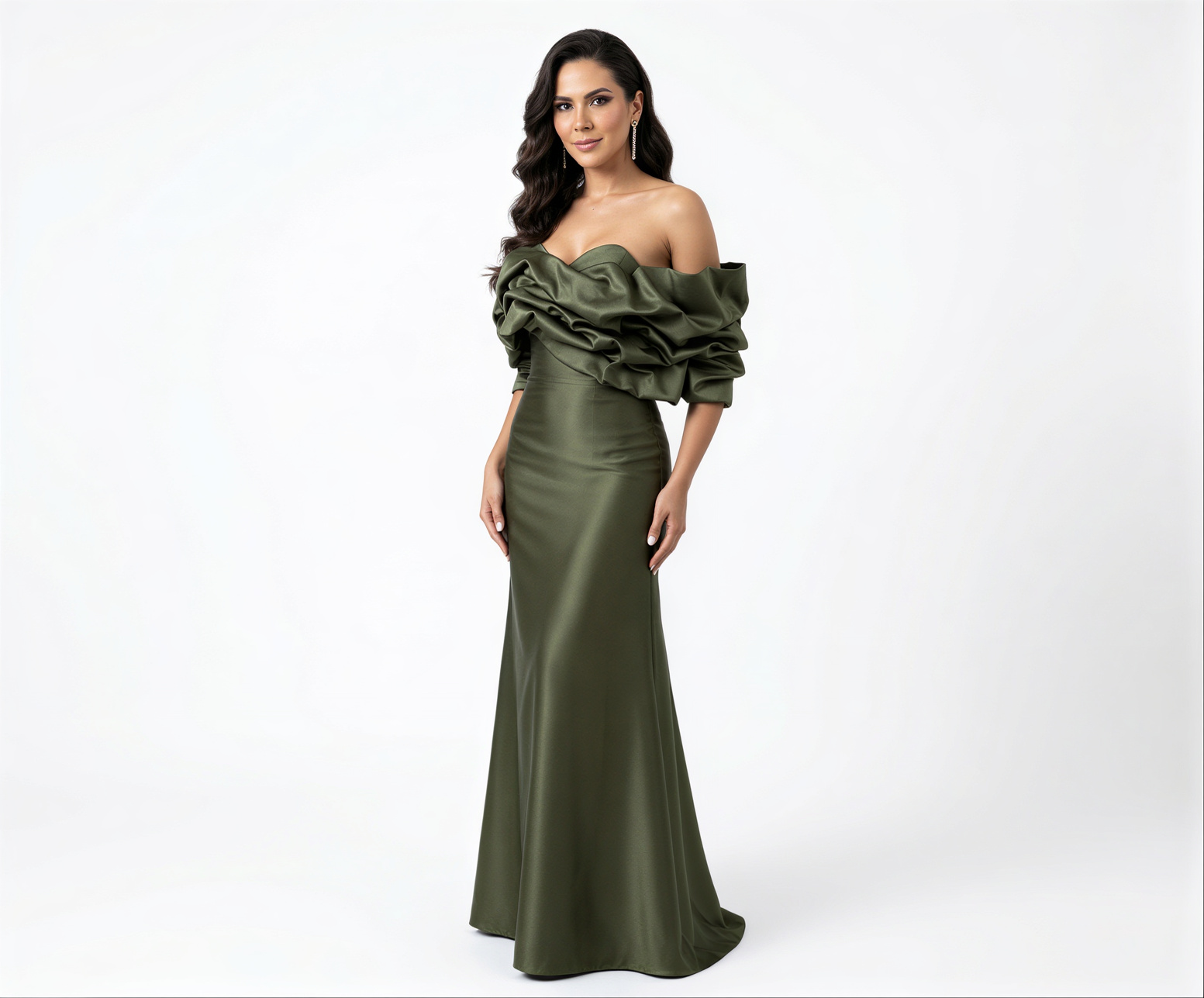 Vestido Verde Oliva Em Zibeline Com Decote Ombro a Ombro e Volume Estruturado No Busto
