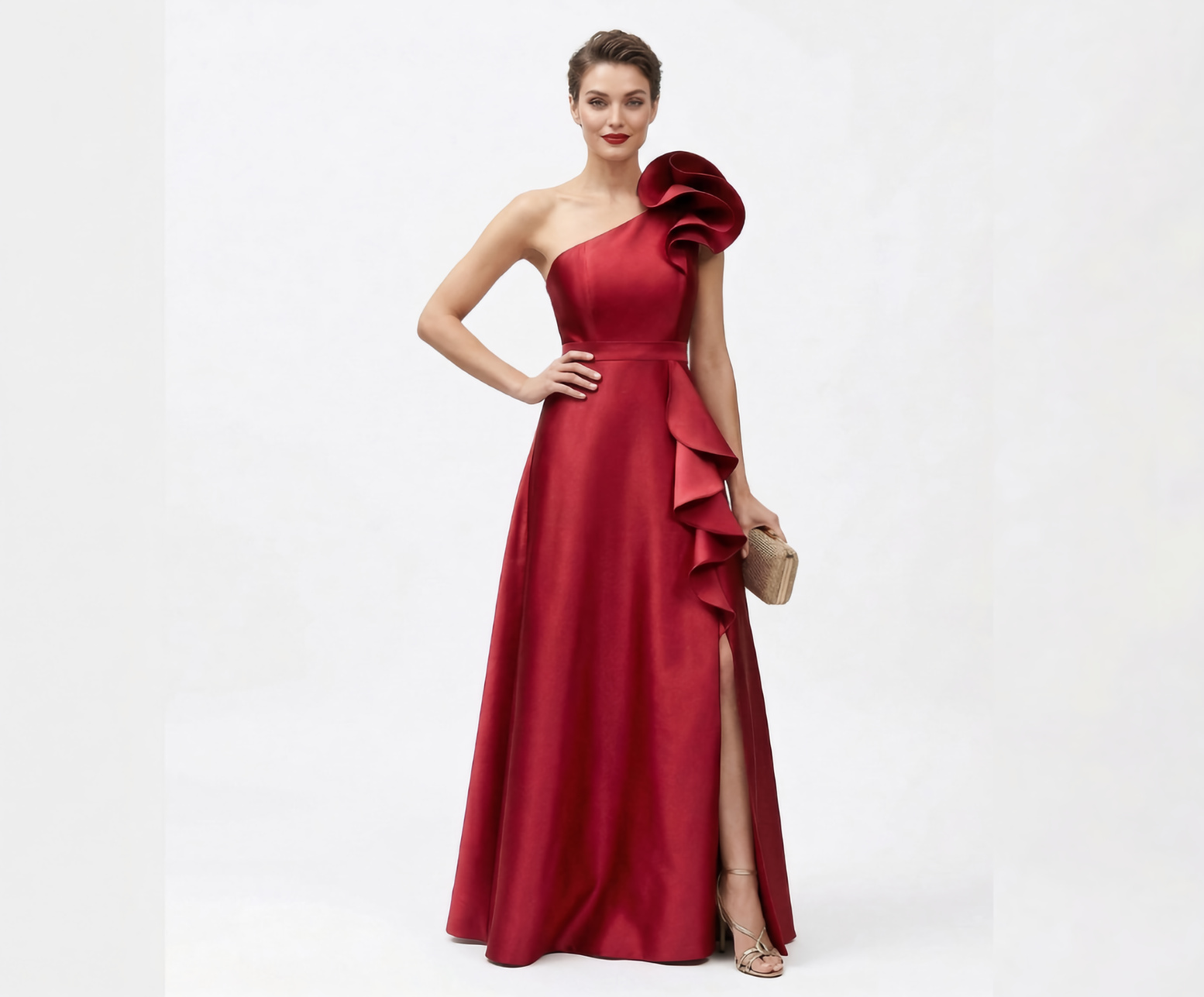 Vestido Vermelho De Um Ombro Só Em Cetim Com Babados e Fenda